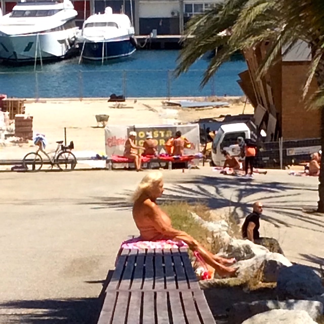 There was a topless area, and one ‘old duck’ is clearly a regular. There she was in all her glory, on a bench overlooking the beach, with nothing but a G string… bless! If the movie ’something about Mary conjures picture, then run with it. This old gal had long blond hair, was as tanned as could be, and had very, very long black painted finger and toe nails! Clearly she is happy in her skin.