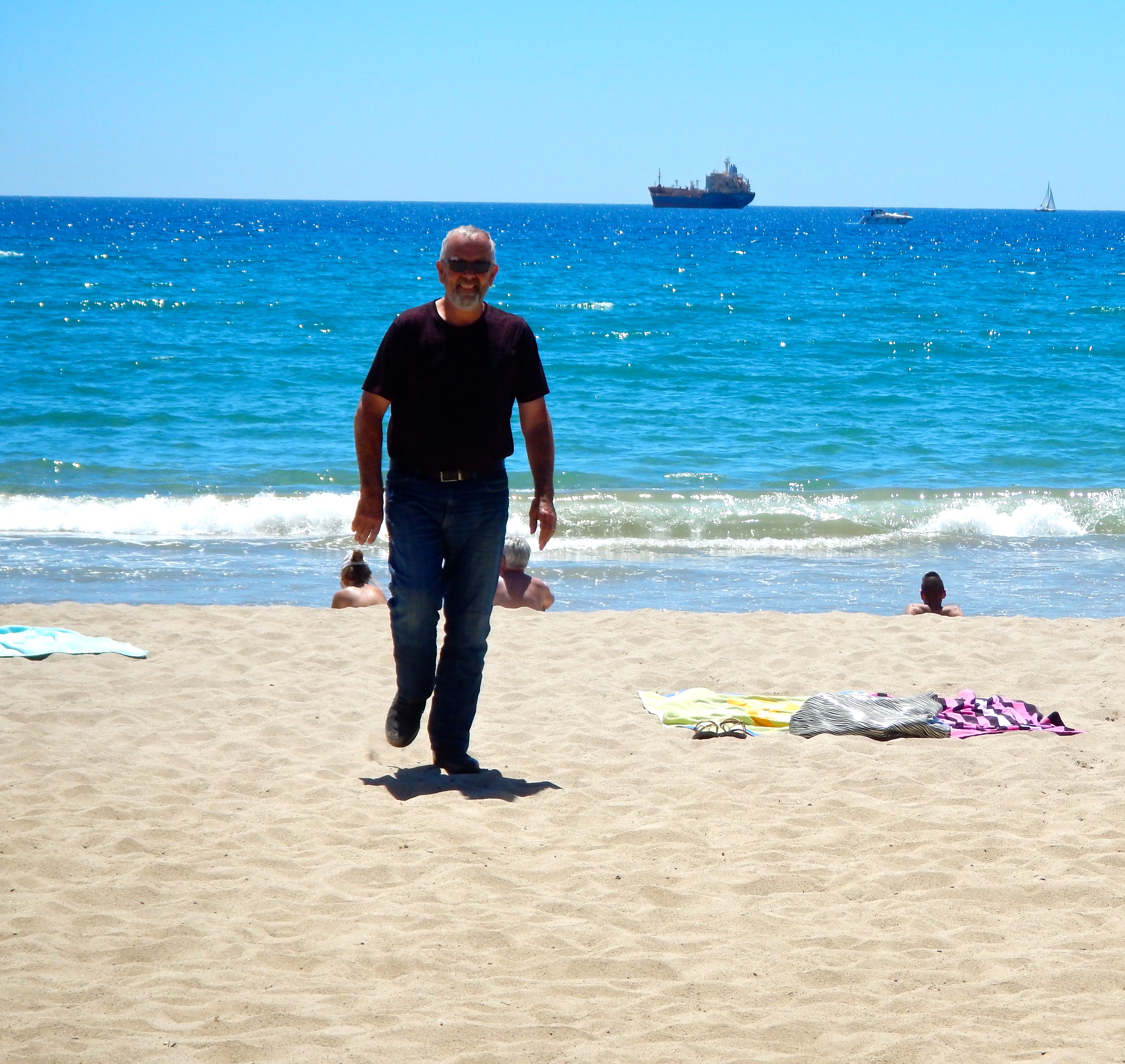 Sat and enjoyed the beautiful vista .. sea.. boats .. cargo ships at anchor .. children playing in the sand.. people sunbathing or simply walking the beach.. just enjoying themselves…. THIS IS THE LIFE! Have decided to stay another night, not a hard decision. A week would have been better, but we have to meet the rest of the crew on Saturday, as we catch the ferry to the UK on Sunday night.